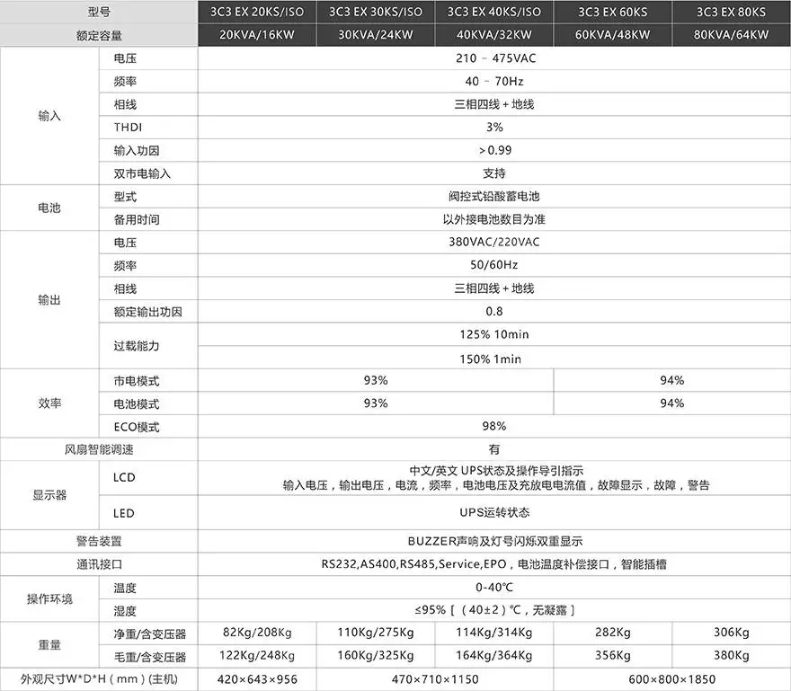 城堡3C3 EX系列UPS每一相由一个单独的PFC电路把交流转换成直流再经过逆变器(Inverter)将直流转换成交流输出。同时,提供一块单独的控制器,对 PFC电路进行的实时控制和数据采集,以使整个系统更协调的运行/更及时的把系统状态反馈给用户。同时,通过对电池充电方式的控制,有效地延长了电池的使 用寿命。双市电的输入结构提高了整个系统的可靠性。3C3 EX系列产品还增加了系统的防护等**,使产品可以在灰尘较大的工业环境下稳定运行。